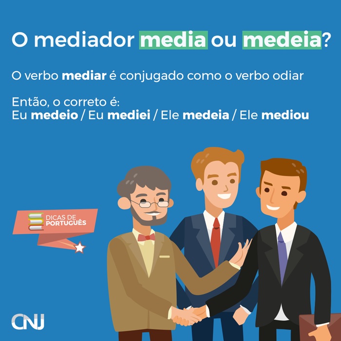Descrição da imagem #PraCegoVer e#PraTodosVerem: Ilustração de três homens engravatados. Dois deles estão apertando as mãos um do outro. Texto: O mediador media ou medeia? O verbo mediar é conjugado como o verbo odiar. Então, o correto é: eu medeio, eu mediei, ele medeia, ele mediou. Selo "Dicas de Português". CNJ
